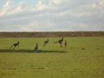 better. Though a smaller herd it was much closer to the road. Initially they hopped away as I exited the van, giving me some excellent “action” photos. Then they did something very rare; they actually hopped TOWARD us and fanned out, giving us an unusually good photo op. SO good in fact, that the many hypocrites in the van (including the aforementioned woman who said she wouldn’t leave the van for some bloody roos) were madly clicking away with their cameras. In fairness, the lady in question did NOT in fact leave the van. Whatever.